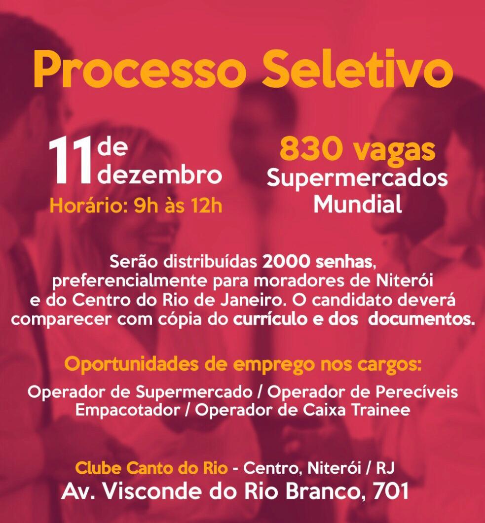 Serão nada, nada menos que 830 vagas de empregos para a mais recente unidade da grande rede Supermercado Mundial, pela primeira ela vez ele alocará um loja fora da capital carioca. O processo seletivo acontecerá na próxima terça-feira (11), das 9h ao 12h, na Avenida Visconde do Rio Branco, 701, Clube Canto do Rio, no Centro de Niterói.