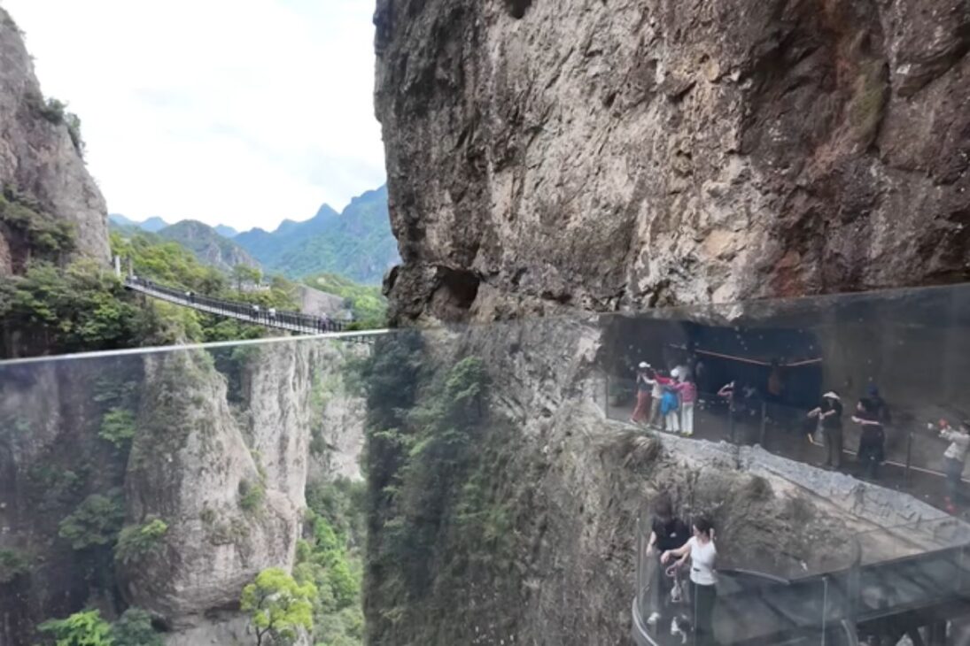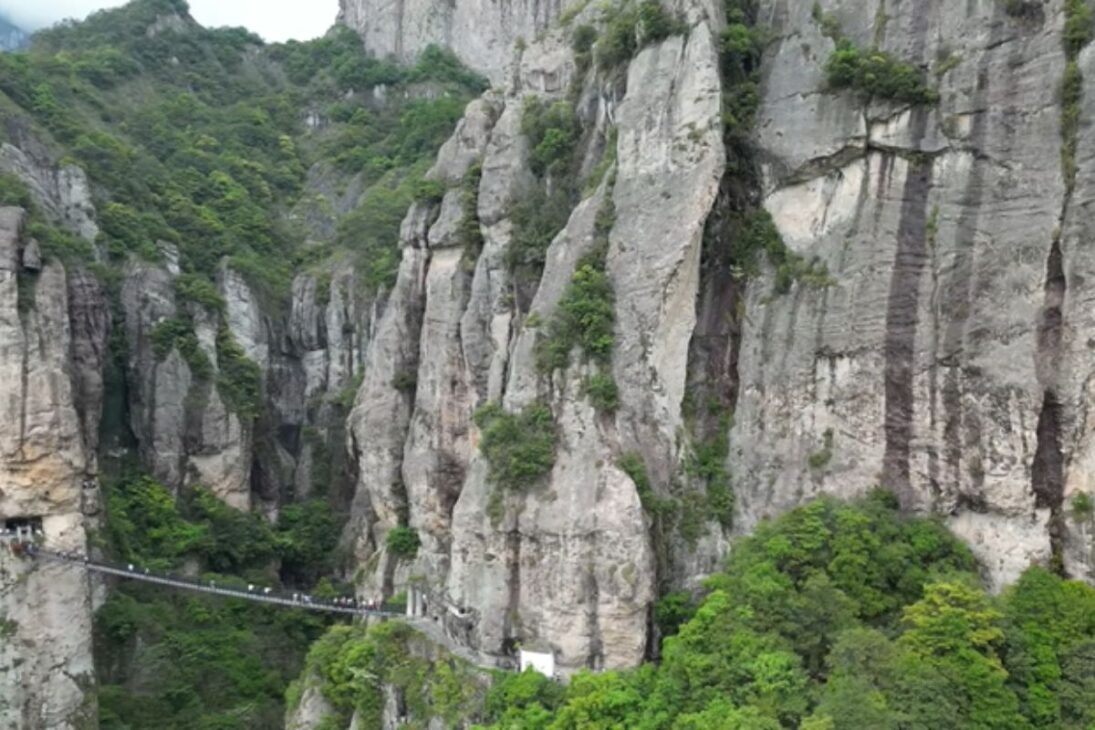 A saída da gruta conduz às passarelas esculpidas diretamente nos penhascos. Conhecido como Silver Cliff Sky Corridor, o caminho se estende por cerca de um quilômetro e está suspenso a 200 metros do solo, oferecendo vistas que misturam vertigem e deslumbramento.