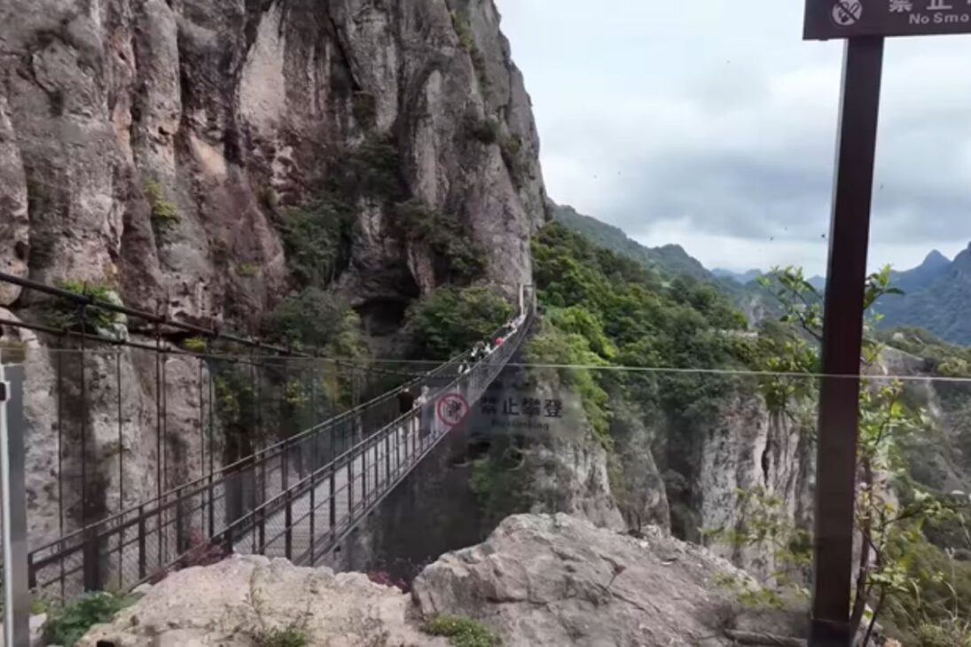 Em outro trecho, uma ponte suspensa liga dois penhascos a 200 metros de altura. Com quase 200 metros de comprimento, a travessia balança levemente com o vento, intensificando a sensação de estar caminhando nas nuvens.