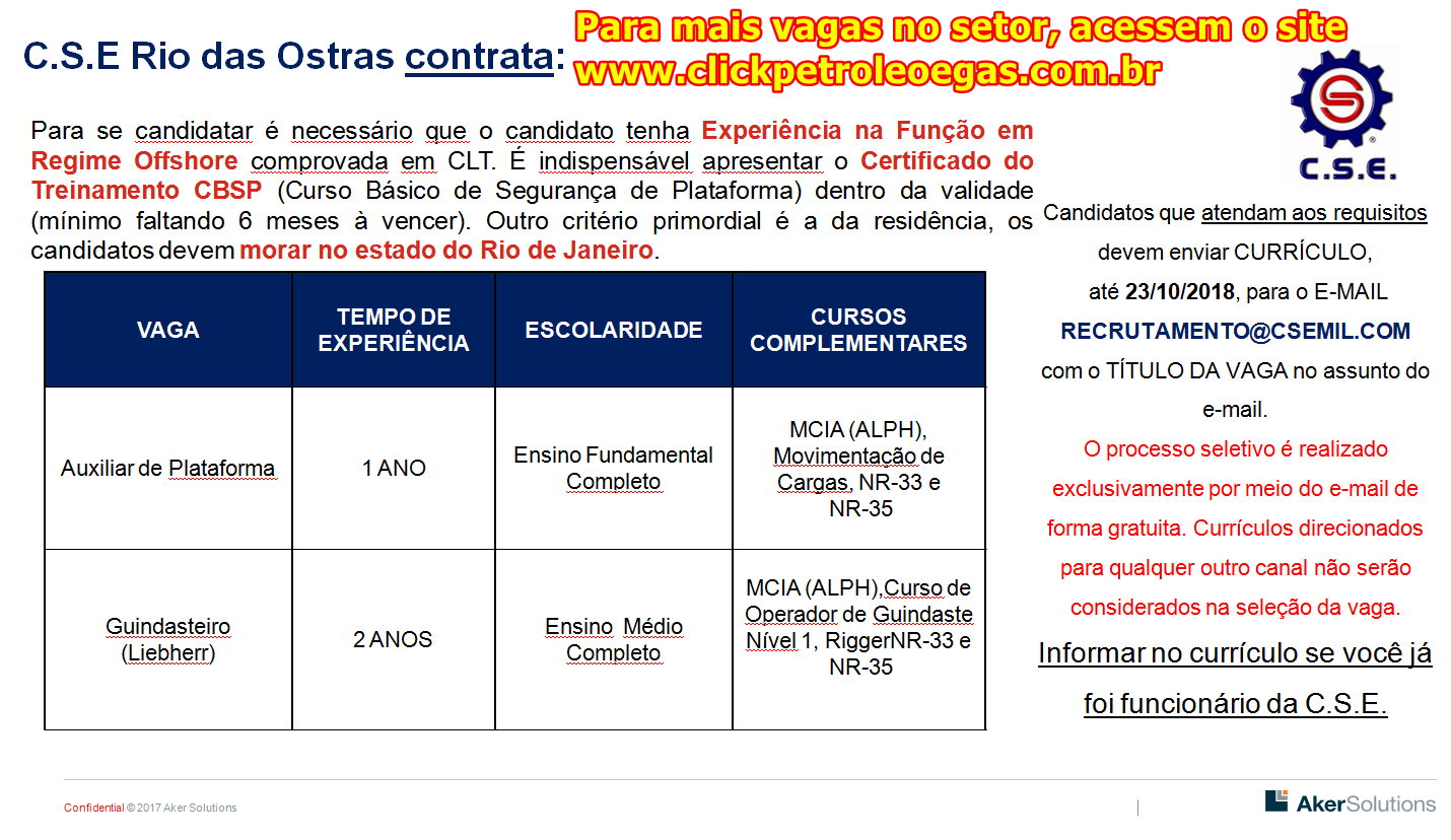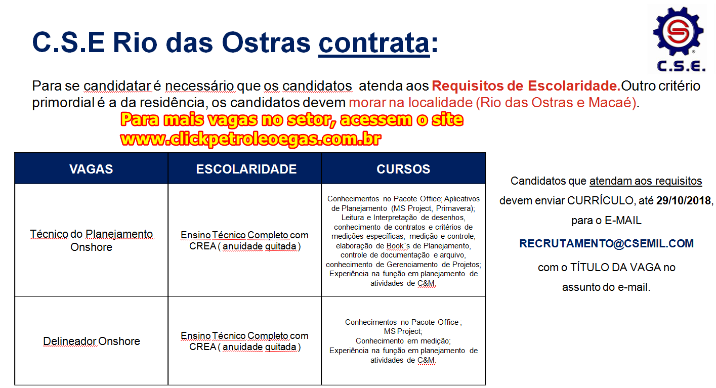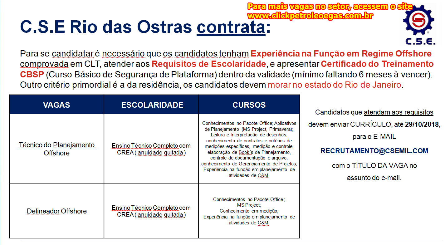 Para as vagas de Auxiliar de Plataforma e Guindasteiro,os currículos deverão ser enviados até o dia 23 de outubro. Para as oportunidades de Técnico de Planejamento e Delineador, o prazo se estenderá até o dia 29 de outubro. Para as funções offshore, será necessário o curso de CBSP ( faltando no mínimo 6 meses para o vencimento) e a prioridade são para moradores do estado do Rio de Janeiro. Interessados podem enviar seus currículos para recrutamento@csemil.com, informando o nome do cargo e se vocês ja foram funcionários da CSE anteriormente. Se desejarem mais vagas offshore atualizadas, cliquem aqui e confiram mais algumas oportunidades hoje.