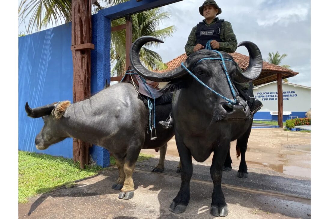 Na Ilha de Marajó, no Pará, policiais patrulham áreas alagadas montados em búfalos. A prática virou símbolo cultural, atrai turistas e foi reconhecida como patrimônio histórico do estado.