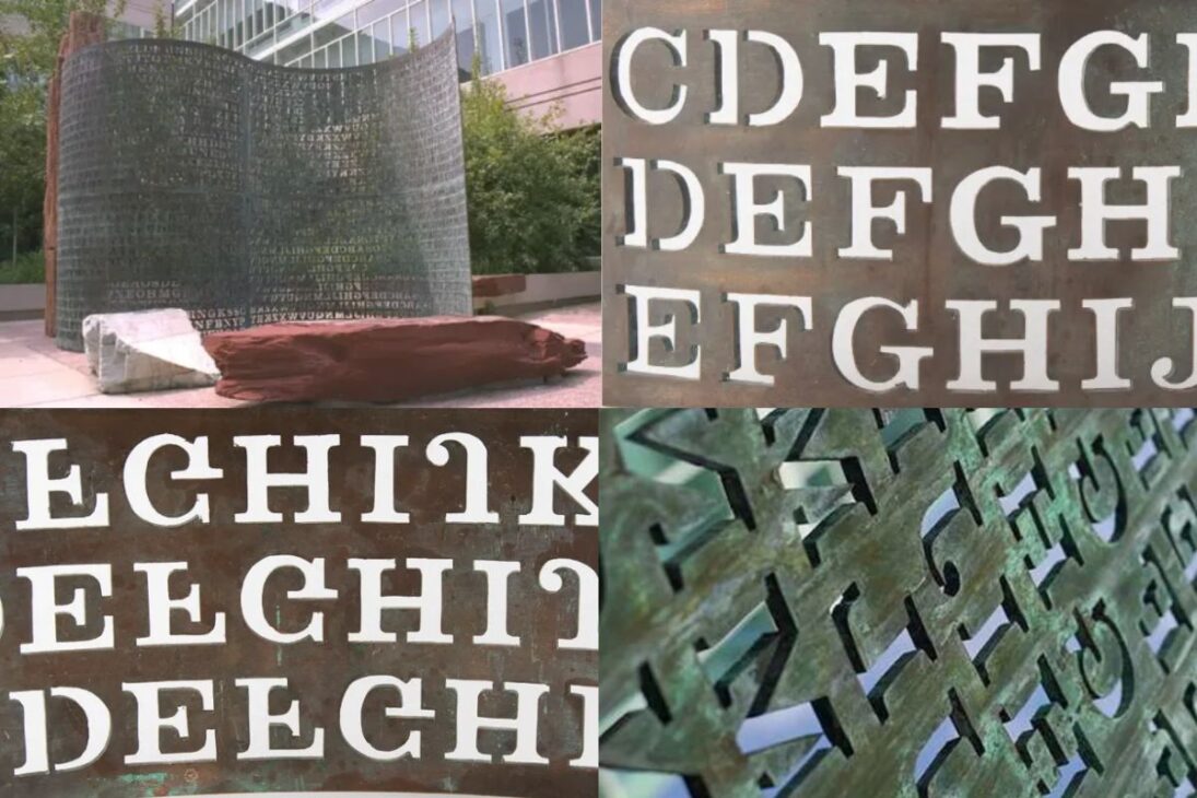 Instalada em 1990, a escultura Kryptos combina arte e criptografia, com 865 letras cortadas em uma chapa de cobre curvada.