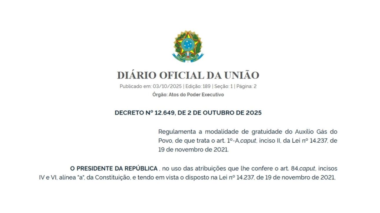 O presidente Luiz Inácio Lula da Silva oficializou, nesta quinta-feira (2), por meio do Decreto nº 12.649/2025, a regulamentação da modalidade de gratuidade do Auxílio Gás do Povo, programa social que garante a recarga gratuita de botijões de 13 kg de gás liquefeito de petróleo (GLP) para famílias em situação de vulnerabilidade.