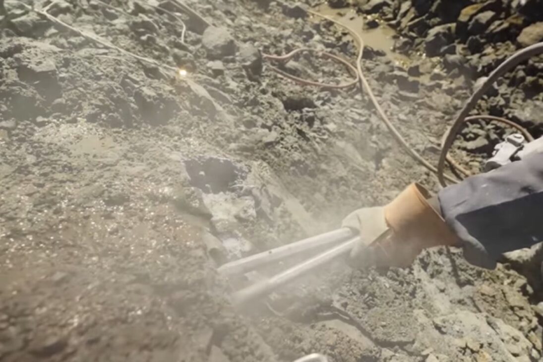 Explosões controladas abrem caminho pelas camadas de basalto, e os mineradores identificam pequenas fissuras que indicam a presença de uma cavidade com cristais.