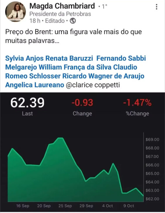 O valor se aproxima de US$ 62 por barril, o menor nível desde junho. Além disso, a executiva publicou um gráfico em suas redes sociais com a frase: “Uma figura vale mais do que muitas palavras”.