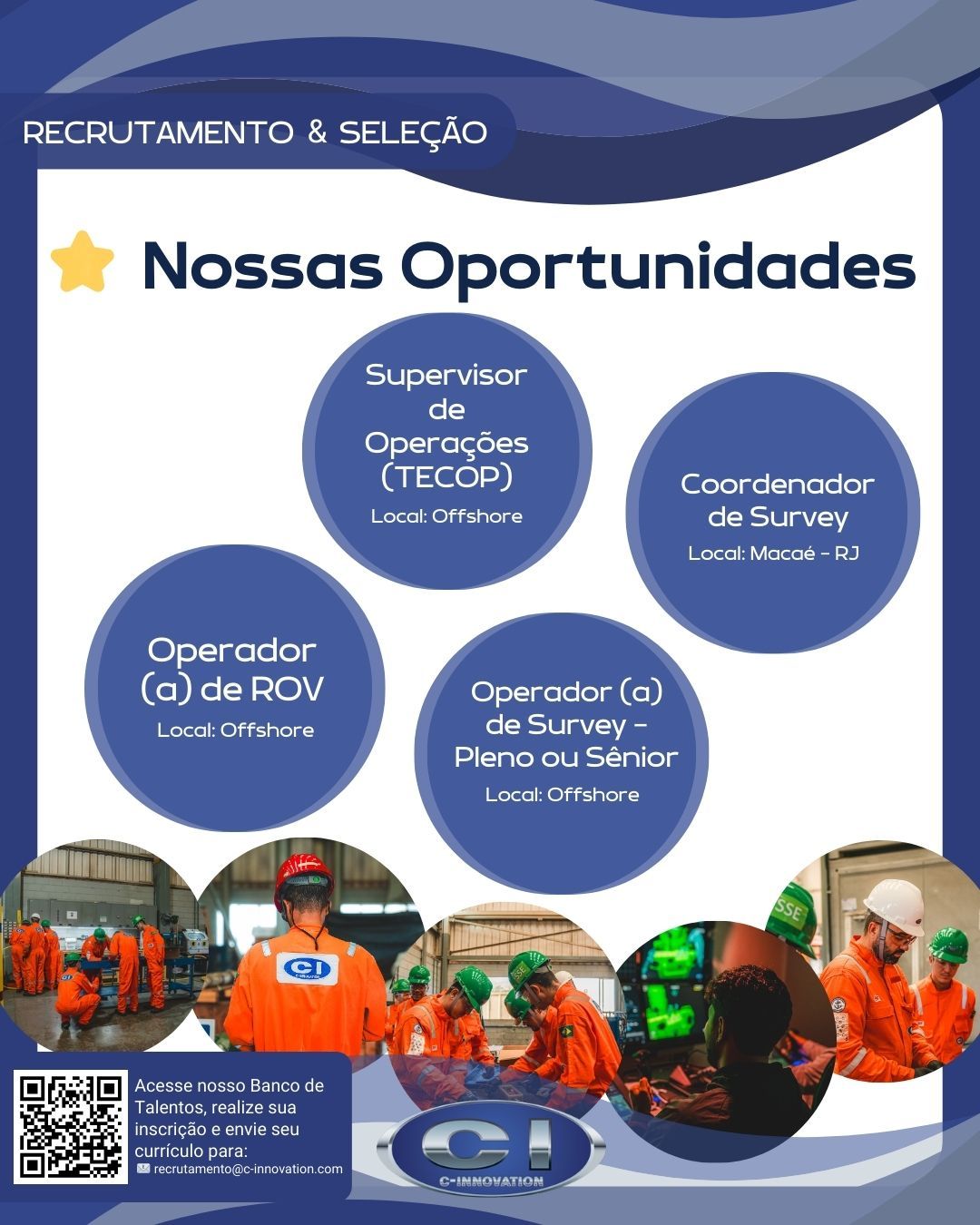 A C-Innovation, empresa referência no setor de robótica submarina e serviços offshore, está com novas oportunidades abertas para profissionais que desejam atuar em projetos desafiadores no mar e em terra. As vagas contemplam posições para Supervisor de Operações (TECOP), Operador(a) de ROV, Operador(a) de Survey Pleno ou Sênior, e Coordenador de Survey — este último com base em Macaé (RJ).