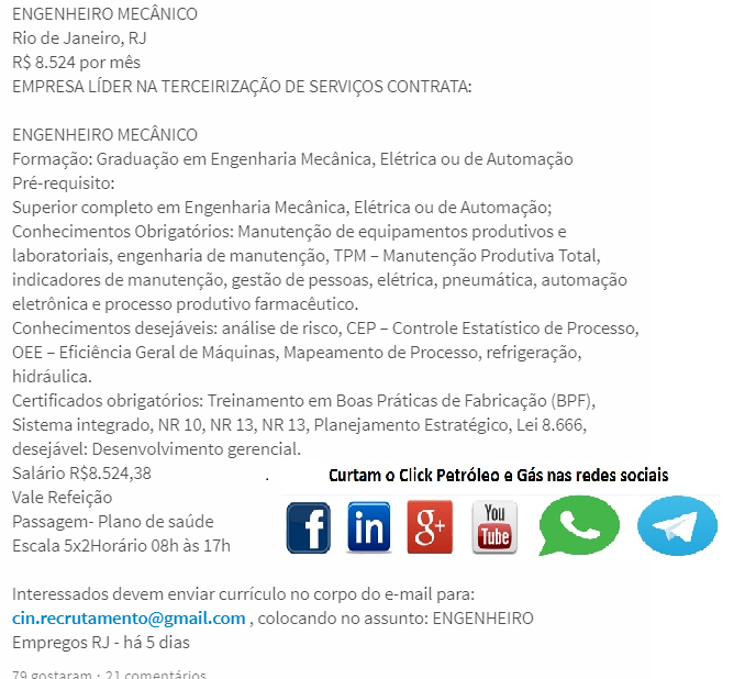 Não esqueçam de participar dos nossos grupos no Telegram, lá postamos vagas e notícias exclusivas. Você tem a opção de seguir agente em outras nas principais redes sociais e não perder nada sobre o setor. : Facebook Linkedin Youtube Google E-mail