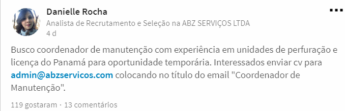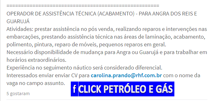 Apesar de algumas oportunidades terem sido publicadas na semana passada, elas ainda estão válidas até o fim desta semana. Elas são para Engenheiro Mecânico, Coordenador de Manutenção, Marinheiro de Maquinas, Técnicos de Manutenção de Motores Diesel, 18 vagas para Técnicos em Mecânica e Elétrica, Coordenador de Operações, Consultor de Serviços Técnicos, Supervisor de Cargas Marítimo, Técnico em Eletrônica, Operador Trainee, Analista de Tecnologia da Informação, Técnicos de Operações Offshore, PCD’s em empresa marítima, assistente de RH em empresa marítima, Técnico de Planejamento, Inspetor de Elétrica, Técnico em Química, Operador Técnico e Técnico de Manutenção Mecânica.